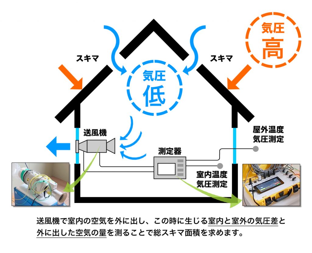 気密測定とは、住宅のスキマの大きさを調べることです。